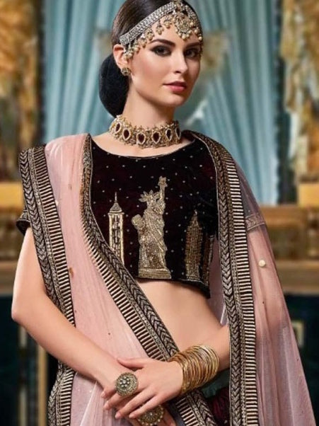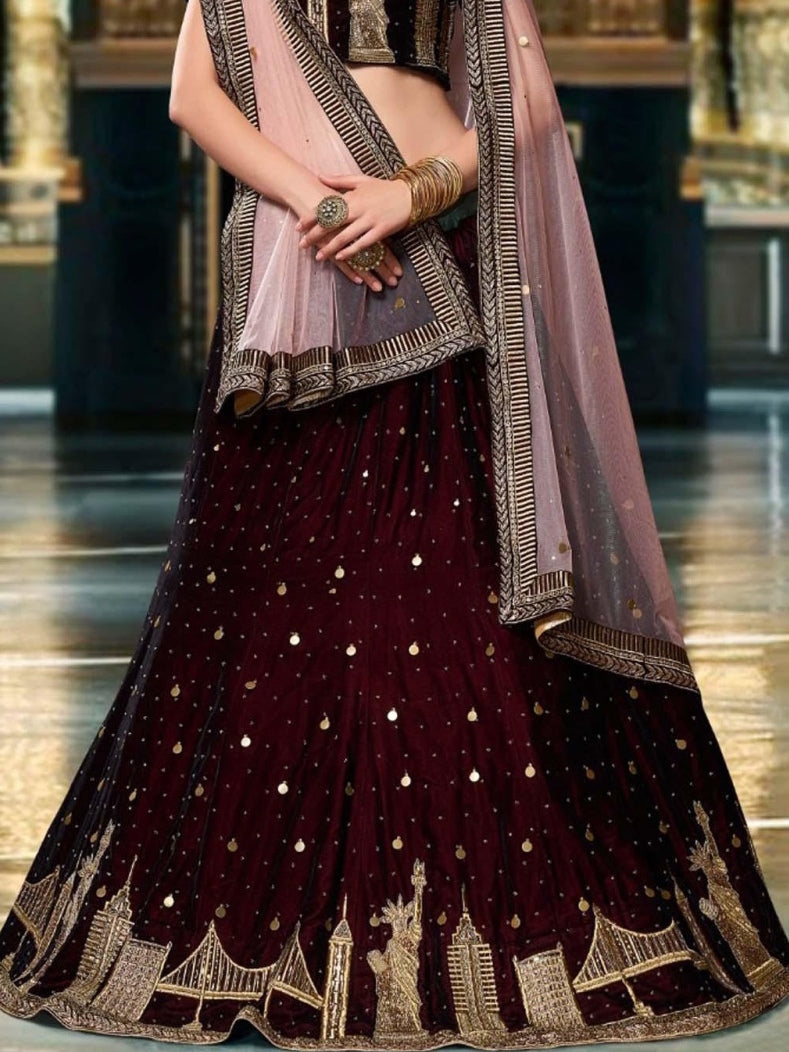 Wine Velvet Designer Lehenga Choli with Embroidered Net Dupatta Lehenga Choli